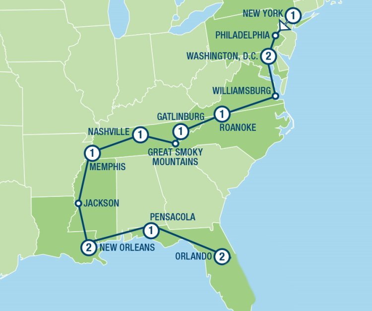 Een bijzondere rondreis van New York en Washington naar Florida, vol historie, muziek en pretparken. Na de prachtige natuur van de Great Smoky Mountains reist u door verschillende muziekstijlen, van ‘blues & rock ’n roll’ in Memphis naar ‘country & western’ muziek in Nashville tot het swingende New Orleans. U eindigt in Florida, met een bezoek aan de ‘Walt Disney-hoofdstad’ Orlando.