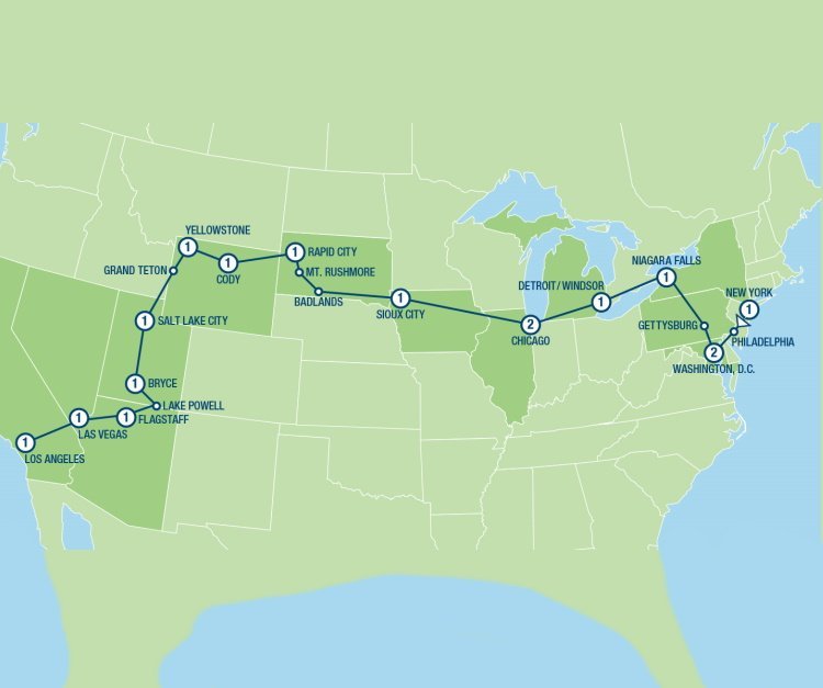 Tussen de steden New York en Los Angeles heeft u ca. 6.000 kilometer te overbruggen. De meest comfortabele manier dit te overbruggen is per luxe touringcar. Alle tijd om met uw reisgenoten van gedachten te wisselen, even weg te dommelen en vooral te genieten! Op de route liggen o.a. de hoofdstad Washington DC, de smeltkroes Chicago; Salt Lake City, de Mormonenstad en Las Vegas hét gokparadijs van de USA. Overspoeld door natuur wordt u in de Nationale Parken zoals Badlands, Yellowstone, Bryce- en Grand Canyon. U eindigt de reis in Los Angeles, bij de meesten van ons bekend om Hollywood, de sterren, de Oscar’s, de Walk of Fame en de pretparken.