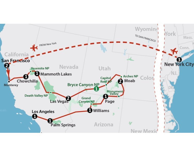 Op naar Amerika. U start de reis eerst met een individueel bezoek aan New York van 3 dagen. Vervolgens vliegt u door naar het afwisselende westen van de Verenigde Staten, een absolute pracht van een reisbestemming! We nemen u mee door overweldigende natuurparken van wereldfaam, door warme en kleurrijke woestijnen, over schitterende kustwegen met als hoogtepunt de 17-mile Drive en naar bruisende wereldsteden als San Francisco, de unieke gokstad Las Vegas en Los Angeles. De veelzijdige Nationale Parken, zoals Yosemite NP, Bryce Canyon en één van de zeven natuurwonderen de Grand Canyon worden vanzelfsprekend niet overgeslagen! Bent u klaar voor een onvergetelijke reiservaring in het land van de onbegrensde mogelijkheden?