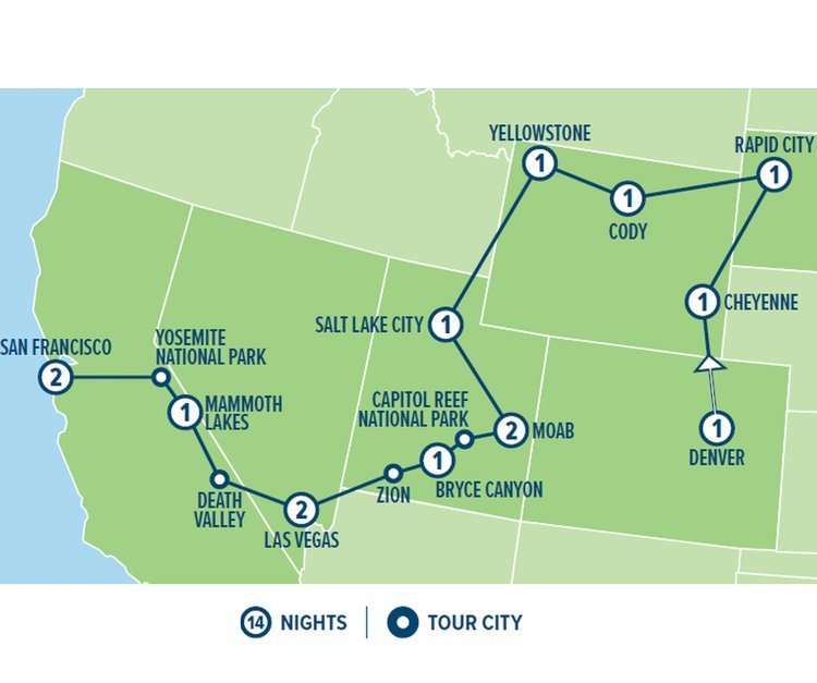 Een unieke reis die door maar liefst zes bekende én minder bekende staten van Amerika gaat. U gaat in elk geval de meest bekende en mooiste nationale parken van Amerika zien. Een reis met vele hoogtepunten zoals de Rocky Mountains, Mount Rushmore en Yellowstone, waar de actieve sporen van onvoorstelbaar geologisch natuurgeweld duidelijk zichtbaar zijn. Er is ruim de tijd ingepland voor bezoek aan Arches en Canyonlands. Maar ook de natuurwonderen zoals Bryce Canyon en Yosemite National Park ontbreken niet. Naast Las Vegas verblijft u in de bekende kustplaats San Francisco waar deze groepsreis van 2 weken langs de mooiste parken van Amerika wordt afgesloten.