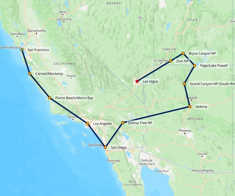 Deze camperreis biedt een ideale mix van spectaculaire natuurparken, bruisende steden en ontspannen kustplaatsen. Van de zonnige stranden van Los Angeles tot het ruige landschap van de Grand Canyon en de imposante bomen van Sequoia National Park, elke dag brengt een nieuw avontuur. U reist langs de schilderachtige Pacific Coast Highway, ontdekt de charme van San Francisco en geniet van de indrukwekkende woestijnlandschappen van Joshua Tree. Deze reis combineert de vrijheid van een camper met zorgvuldig geplande stops, zodat u optimaal kunt genieten van alles wat het westen van de Verenigde Staten te bieden heeft.