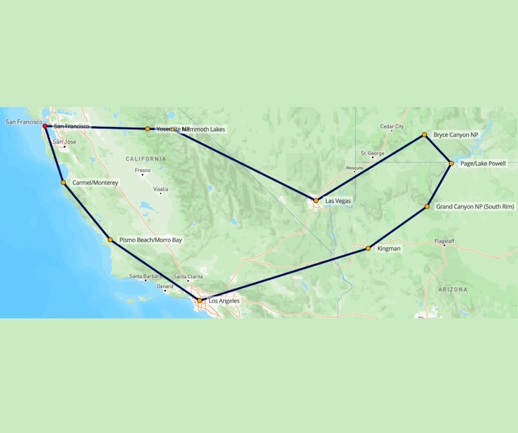 Deze fly drive begint is San Francisco, waarna je via Yosemite, terug langs de westkust en schilderachtige kustplaatsjes, afzakt naar Los Angeles. Hierna rij je het binnenland in naar Sedona en de Grand Canyon. Je reis eindigt in Las Vegas.