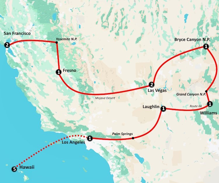 Wilt u in bijna 3 weken tijd de belangrijkste hoogtepunten zien van het zuidwesten van Amerika maar ook Hawaii? Dan is dit de reis die u zoekt! U bezoekt maar liefst 6 verschillende Nationale Parken, namelijk Grand Canyon, Monument Valley, Bryce Canyon, Zion, Death Valley en het bekende Yosemite. Ook de meest bekende steden als Los Angeles, Las Vegas en San Francisco worden uitgebreid bezocht. Aan het einde van de groepsreis vliegt u door naar Hawaii waar u de reis afsluit. Naast een gegarandeerd vertrek wordt deze populaire groepsreis door het westen van Amerika en strandverblijf op Hawaii het gehele jaar uitgevoerd, zowel zomer als winter.
