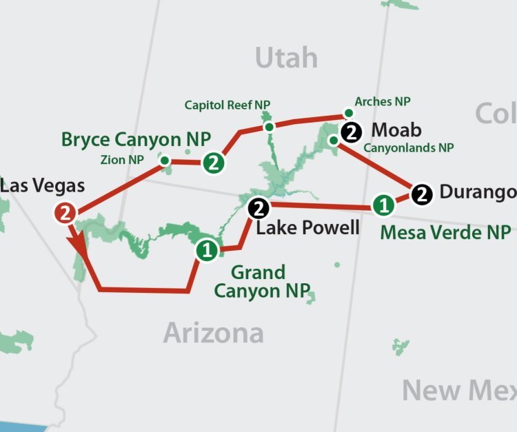 Grand Canyon, Bryce Canyon, Monument Valley en Arches National Park. Bewonder de grootsheid van de canyons, de onwerkelijke rotsformaties in fraaie kleuren, honderden meters hoge monolieten, natuurlijk gevormde bruggen en bogen en eeuwenoude rotswoningen van Indianen. Maak een boottocht over het schitterende Lake Powell, proef de sfeer van het ‘wilde westen’ en maak kennis met het bruisende Las Vegas.