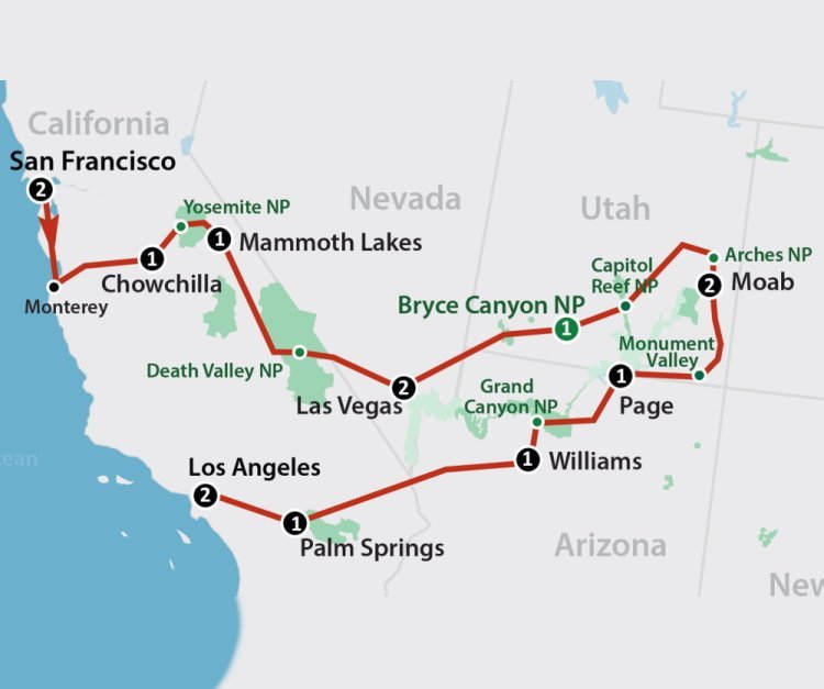 Tijdens deze autorondreis maakt u kennis met magnifieke parken als Yellowstone NP en Grand Canyon, komt u door de overweldigende natuur van het Yosemite NP en beleeft u de heetste temperaturen in Las Vegas en Death Valley. Een afwisselende reis waarin woestijn, bergen, allerlei soorten rotsformaties en veel flora en wellicht ook fauna worden samengebracht. Uiteraard ontbreken steden als Los Angeles, en San Francisco en Denver niet aan deze zeer complete reis. Ook Bryce, Zion en Grand Canyon staat op het uitgebreide programma !