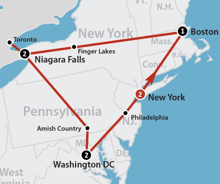 Een korte reis met bezoeken aan New York, Boston, Niagara Falls, Toronto en Washington D.C. U ziet en bezoekt op comfortabele wijze de hoogtepunten van het noordoosten van de Verenigde Staten. Deze reis is uitstekend te combineren met een langer verblijf in New York. Wanneer u via New York naar de westkust of naar Florida reist, kunt u deze korte tour ook als ‘stopover’ arrangement boeken.