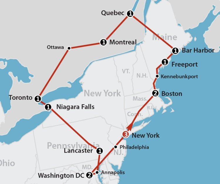 Maak kennis met de bakermat van Amerika en Canada. Geniet van grootse wereldsteden, te beginnen met Boston. Hierna de grens over naar Canada: Québec City, Montréal, Ottawa en Toronto. Terug in Amerika bezoekt u tot slot Washington D.C. en New York. Elke stad is zeer de moeite waard, met haar eigen karakter en tal van bezienswaardigheden. Kleine dromerige plaatsen in New England, langs de Atlantische kust en in het binnenland, schitterende natuur met hoogtepunten als de Niagara Falls zijn evenzeer onderdeel van deze reis. Bent u hier in het najaar dan beleeft u tevens de kleurenpracht tijdens de Indian Summer.